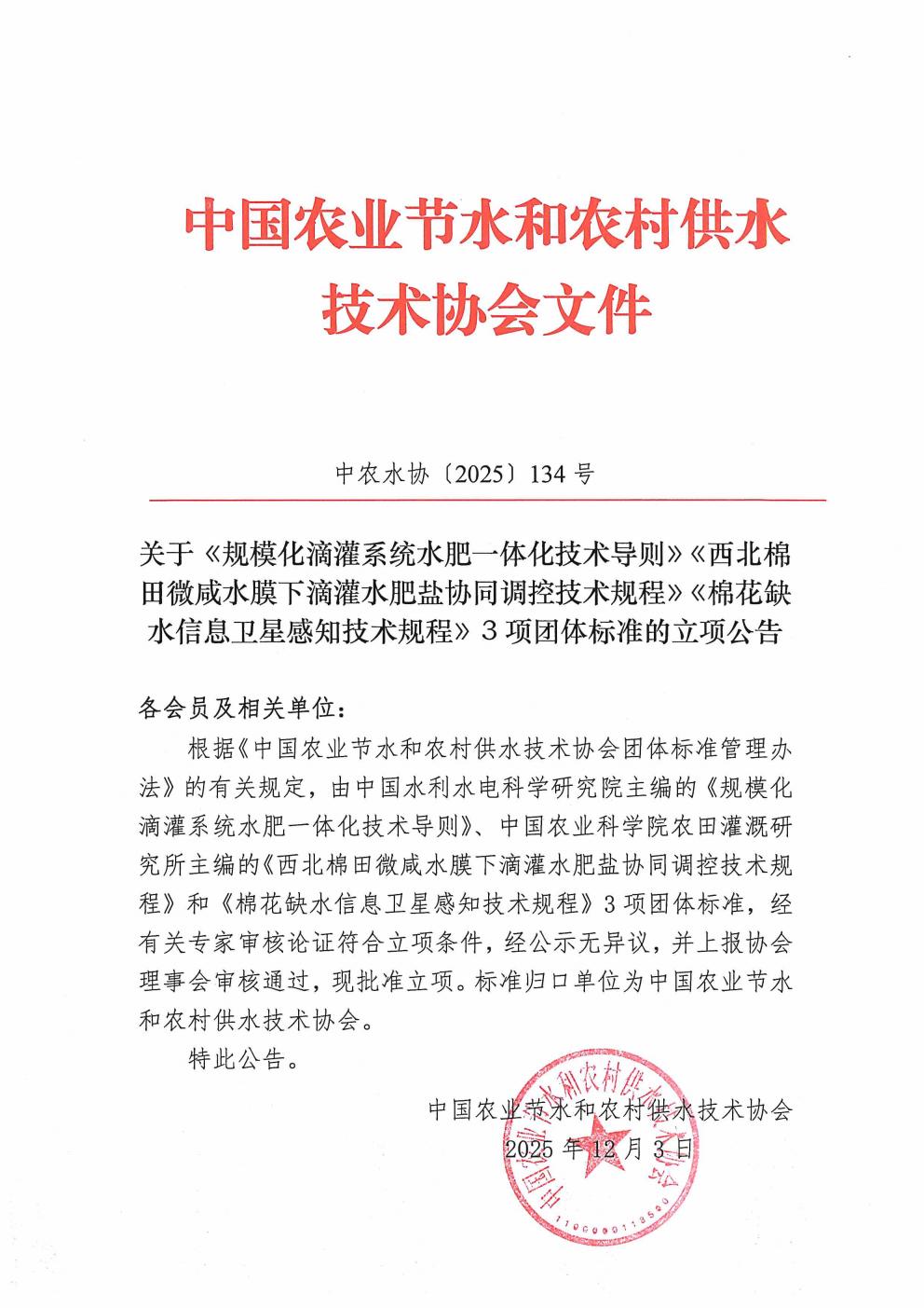 关于《规模化滴灌系统水肥一体化技术导则》《西北棉田微咸水膜下滴灌水肥盐协同调控技术规程》《棉花缺水信息卫星感知技术规程》3项团体标准的立项公告
