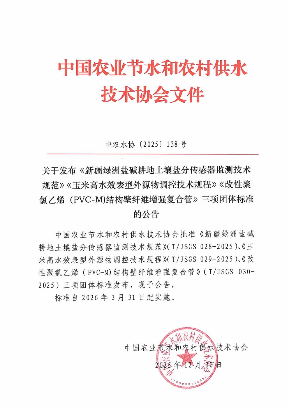 关于发布《新疆绿洲盐碱耕地土壤盐分传感器监测技术规范》《玉米高水效表型外源物调控技术规程》《改性聚氯乙烯(PVC-M)结构壁纤维增强复合管》三项团体标准的公告