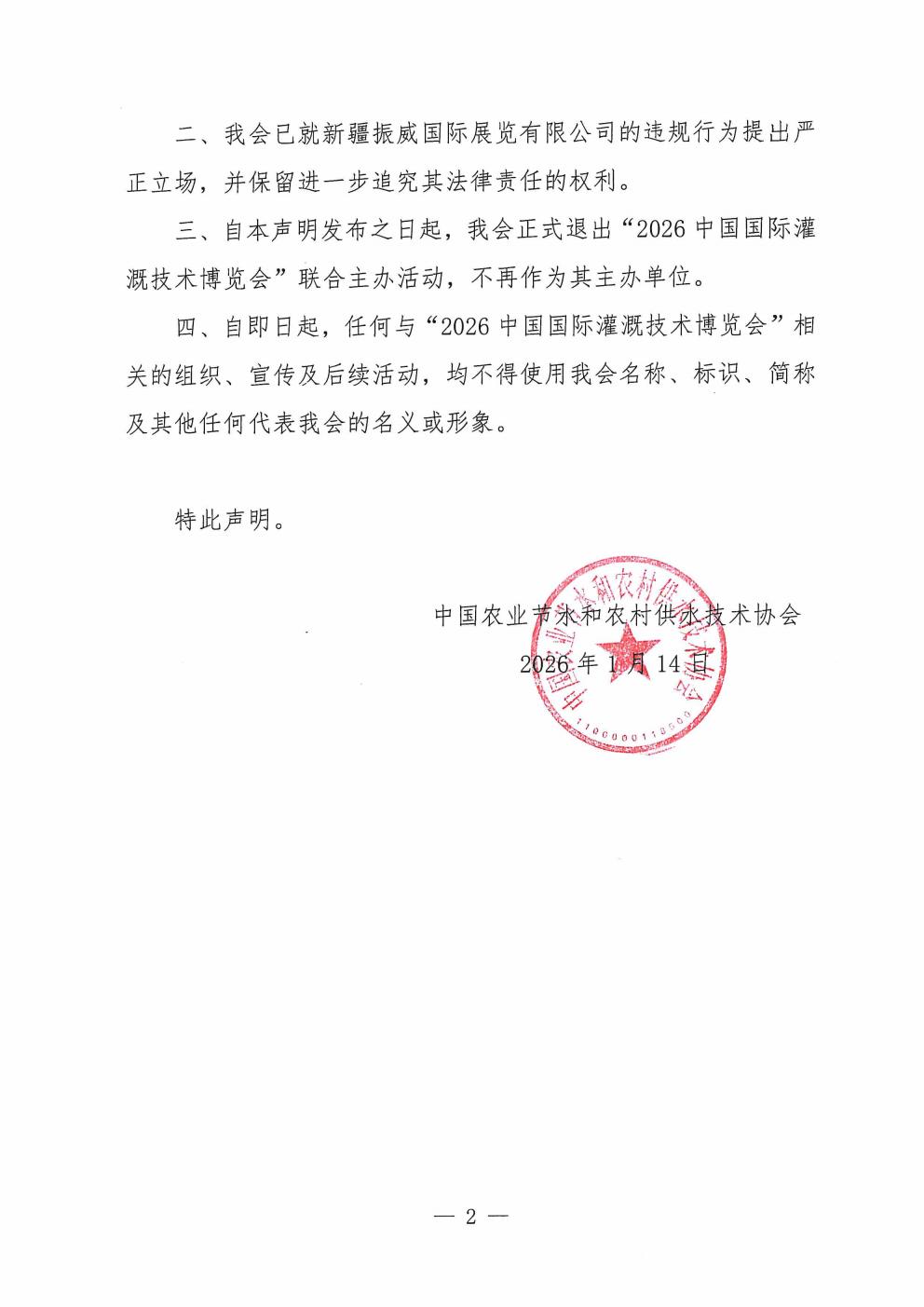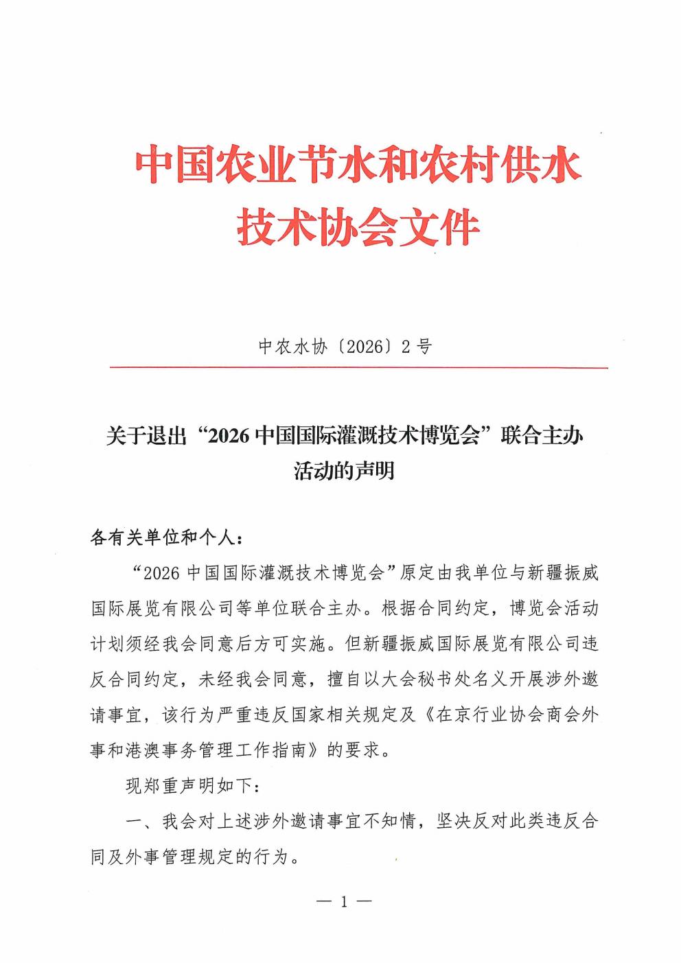 关于退出“2026北京国际灌溉技术博览会”联合主办活动的声明