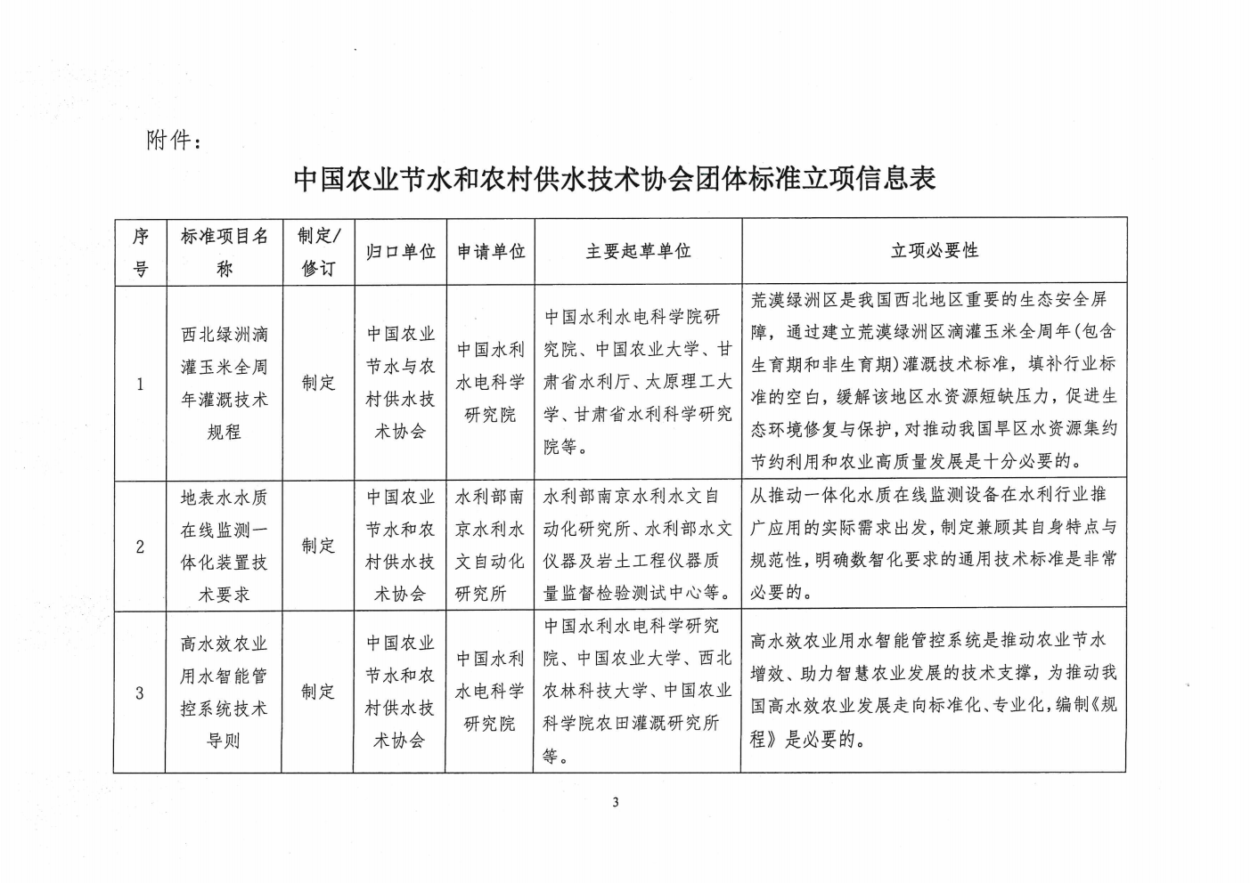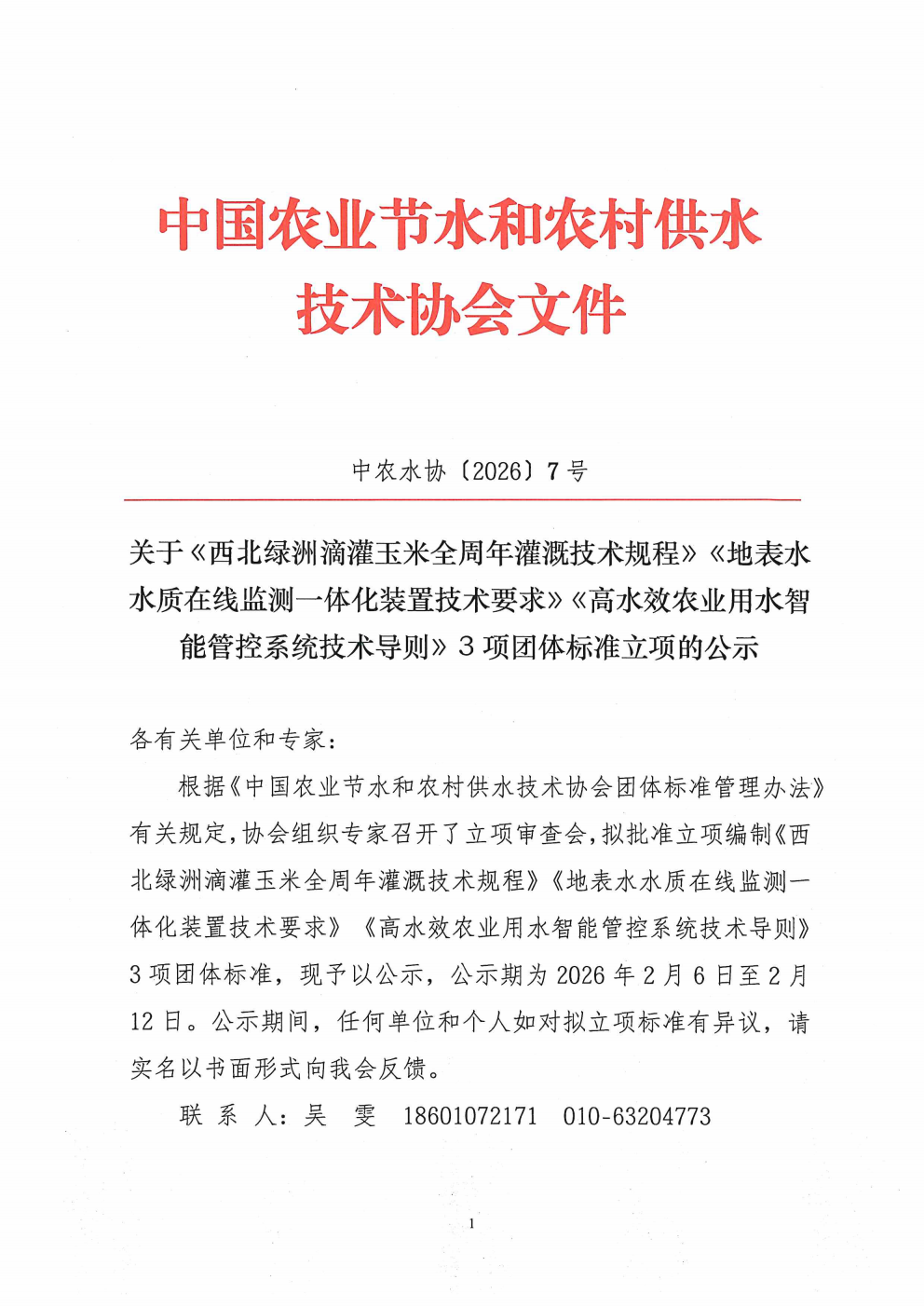 关于《西北绿洲滴灌玉米全周年灌溉技术规程》《地表水水质在线监测一体化装置技术要求》《高水效农业用水智能管控系统技术导则》3项团体标准立项的公示