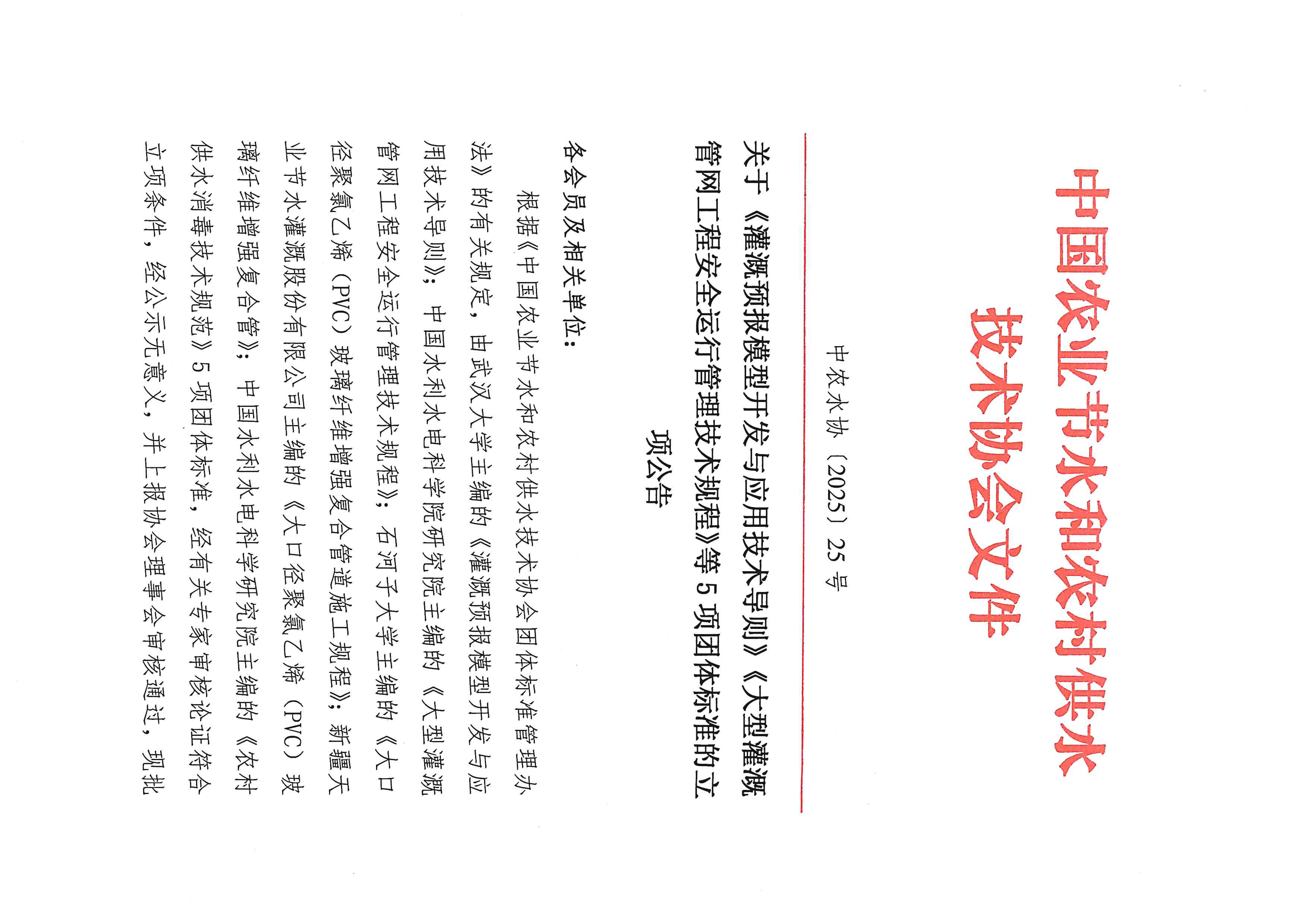 关于《灌溉预报模型开发与应用技术导则》《大型灌溉管网工程安全运行管理技术规程》等5项团体标准的立项公告